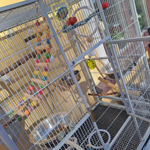 Stor silver fågelbur på hjul med flera sittpinnar och stor frontdörr. Utdragbar bottenbricka och hylla under buren för förvaring.