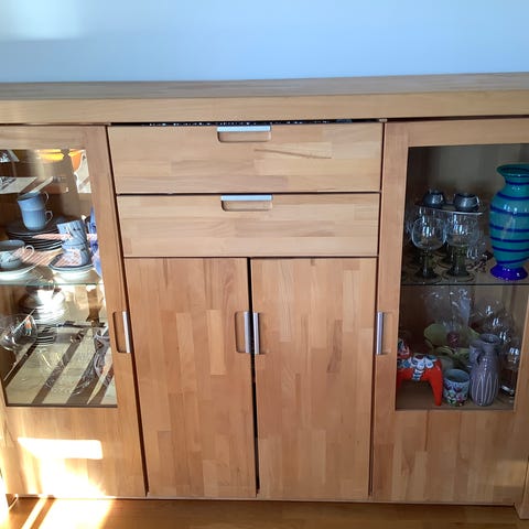 Ljus Ek med hyllsystem och glasrutor i dörrarna