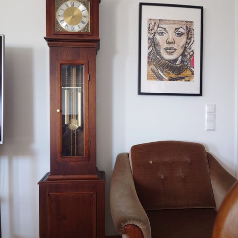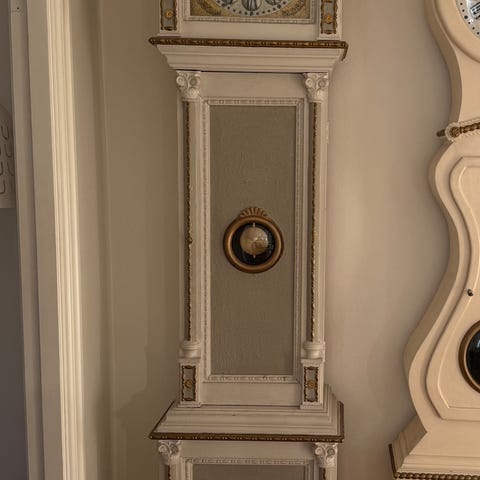 Vit golvklocka med pendel och glasdörr fram. Dekorativa detaljer i guld runt urtavlan och på lod och pendel.