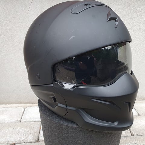 Svart Scorpion EXO-Combat (bandit) integralhjälm med nedfällbart solvisir. Avtagbart hakskydd och ventilationsöppningar upptill.