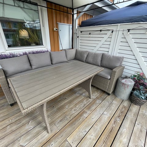 Hörnsoffa med bord för uteplats, dynor och överdrag inkluderat. Soffan är ca 180x240 cm. Bra skick! Bordsskivan har blivit lite solblekt på sina ställen men inget som påverkar särskilt. Går även att montera om soffan så den blir spegelvänd om man skulle vilja. Kan hämtas 8e, 24e, eller 30e maj.