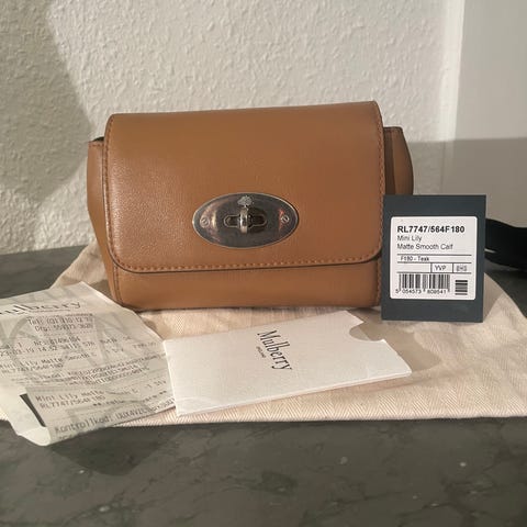 Interiör: Fodrad med Mulberrys klassiska logotyg. Flera innerfack för bra organisering.
