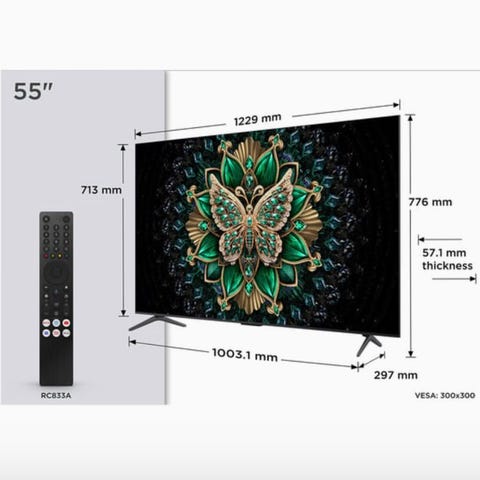 Samsung Crystal UHD 65 tum TV med tunn AirSlim-design. Har mittstativ och fjärrkontroll med solcellspanel på baksidan.