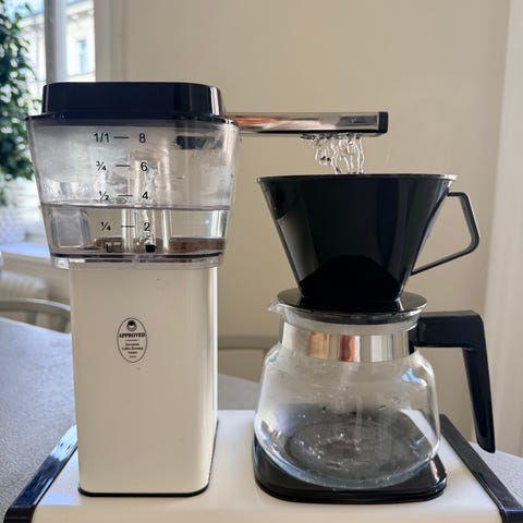 Moccamaster kaffebryggare i rostfritt med termoskanna och genomskinlig vattentank med nivåmarkeringar. Bryggaren har svart filterhållare upptill och strömbrytare på foten framtill.