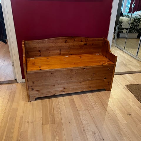 Vacker allmogesoffa i ”mini-modell” för barn. Jättegullig. Passar som huvudgavel till säng eller som förvaringssoffa, kanske till lekstugan eller barnrummet? Gediget trä. Har lite blandat med små skavanker / patina.