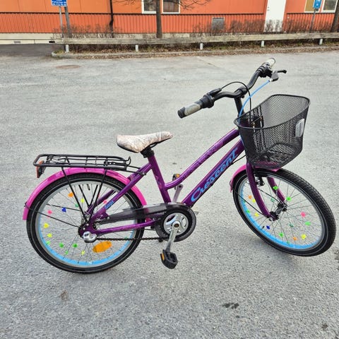 Fina färger och fotbroms samt handbroms fram. Med lite omsorg så blir denna cykel perfekt i sommar. Cykeln är inte i nyskick utan har små skavanker, tex stödet saknar sin plastplugg och handtagen är av nån anledning tejpade runt sig.