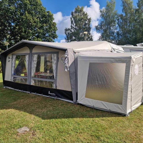 Ett rymligt och stabilt förtält med Penta-form som ger extra golvyta och bra rymd. Perfekt för både säsong och längre uppställning.