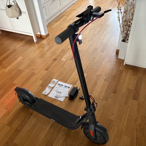 Toppskick. Allt funkar som det ska. Cirka 30 km räckvidd. Maxhastighet cirka 30-35 km/h. Laddare följer med. Punkteringsfria däck fram och bak. Priset går att diskutera vid snabb affär.