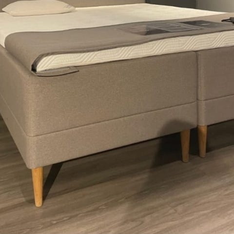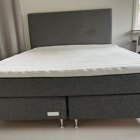 IKEA SNARUM kontinentalsäng i grått tyg med träben. Ingår övermadrass på toppen för extra komfort.