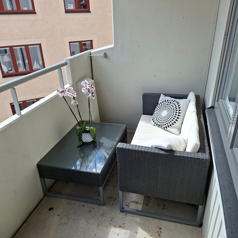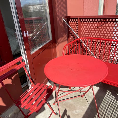 Röd metallsoffa/bänk för uteplats eller balkong. IKEA Brusen.