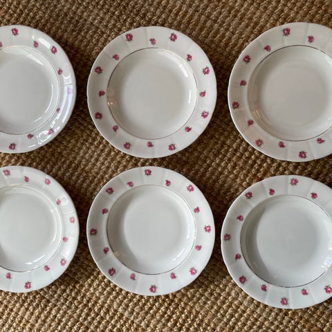 INGÅR: 16 stora tallrikar, ca 24-25 cm diameter. 16 assietter. 6 efterrättsskålar. 2 stora skålar, ca 19 cm diameter. 1 större skål, 25cm. 2 stora Fat, 34 cm långa. Samt då två koppar/fat Gustavsberg.