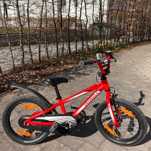 Röd barncykel från Specialized med 16" hjul och stödhjul. Utrustad med fotbroms bak och handbroms fram.