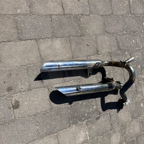 Nya ljuddämpare till motorcykel i svart med rundad triangel-form på änden.