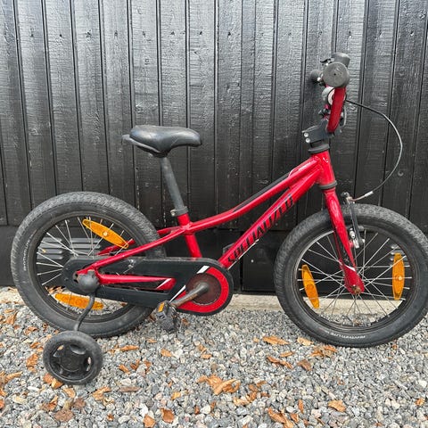 Röd Specialized riprock barncykel med 16" hjul och grova däck. Utrustad med fotbroms, reflexer och en liten cykelkorg fram.