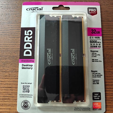Crucial Pro DDR5 RAM-minne 32GB (2x16GB) för stationär dator. Sitter i originalförpackning med svart värmespridare.