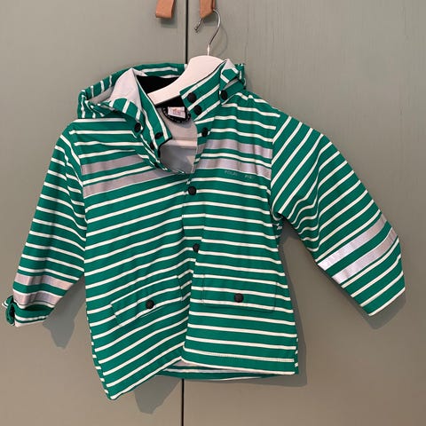 Flerfärgad skaljacka från Didriksons i stl 80, unisexmodell med huva. Knäpps med tryckknappar fram och har randigt mönster.
