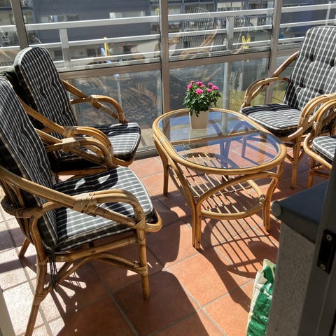 Äldre tresitssoffa och två fåtöljer i rotting. Blommiga dynor. Gunga och bord på bilden ingår ej. Finns i Hälsinggården Falun.