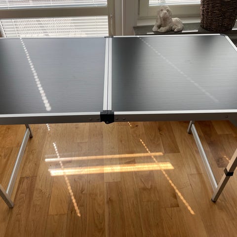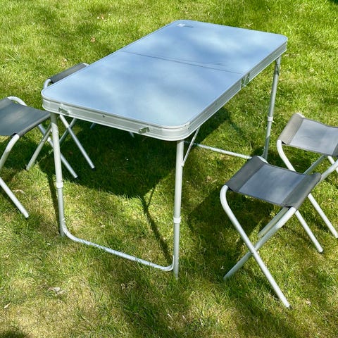 Hopfällbart campingbord med aluminiumstomme och grå skiva. Fyra hopfällbara pallar följer samma stil och allt spänns fast inuti bordet när det är ihopfällt som en väska.