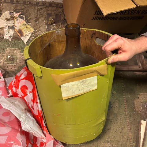 Stor brun glasdamejeanne i trälåda med handtag. Har bygelkork upptill och står stadigt i ramen. 10 liters flaska, träställningen är 40 cm hög.