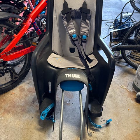 Thule cykelsits med justerbara axelremmar och vadderad insats, max 22kg. Fäste med lås och nyckel samt fotstöd med remmar.