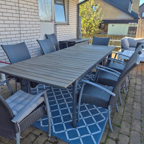 Rektangulärt bord med vitt metall-underrede och grå ribbor av hårdplast. Praktiskt och lätt att underhålla. Bordet har två iläggsskivor (á 50cm) som enkelt viks fram från undersidan av bordet. Sex positions-stolar i vit metall och tygsits i grått som matchar bordets ribbor.