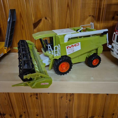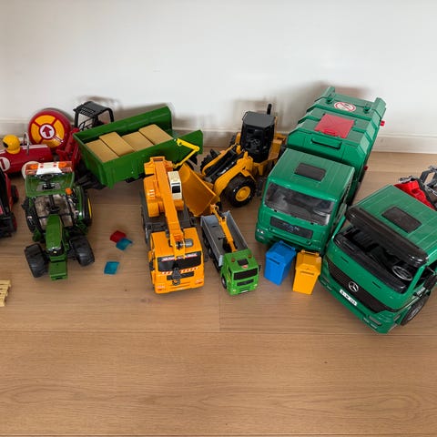 Bruder skogsmaskin/leksakstraktor med timmervagn och rörlig kran. Flera detaljer på vagnen och hytten som går att leka med.