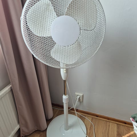 Säljer en vit golvfläkt i gott skick. Den fungerar som den ska och ger bra kylning under varma dagar. Fläkten står stabilt på ett stativ och är lätt att använda. Den har 3 hastigheter. Perfekt för hemmet, sovrummet eller kontoret nu när det börjar bli varmare.