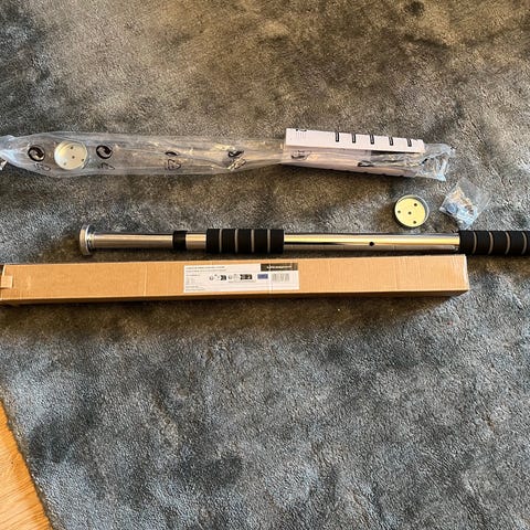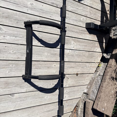 Svart dörrtrapets/chinsstång för hemmaträning. Flera grepp med vadderade handtag för olika övningar.