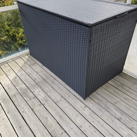 Svart träförvaringslåda för utomhusbruk, med lock som öppnas uppåt. Invändigt är den träfärgad och rymmer gott om saker som dunkar, verktyg eller annat du vill ha under tak.