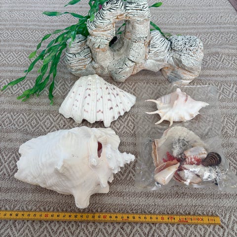 Två akvariedekoration och hävertpump med på köpet får du också tre doppvärmare och en akvariepump skicket är okänt så det är inga garantier att de fungerar.