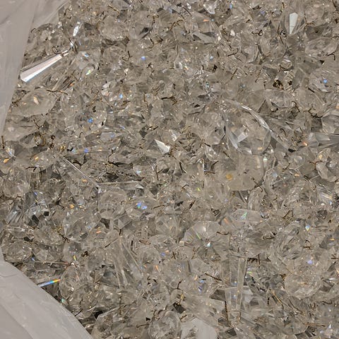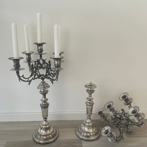 Två dekorativa ljusstakar i mässing med svarta fotdelar och hängande prismor. Rymmer flera kronljus på varje ljusstake och ger ett pampigt intryck på bord eller byrå.