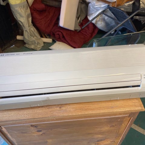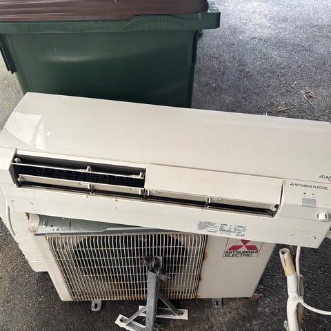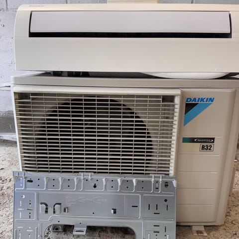 Bosch luft/luft värmepump i vitt utförande. Väggdel med frontlucka, väggfäste i metall och anslutningskabel syns på bilderna. Både inomhus-och utehusdel ingår.