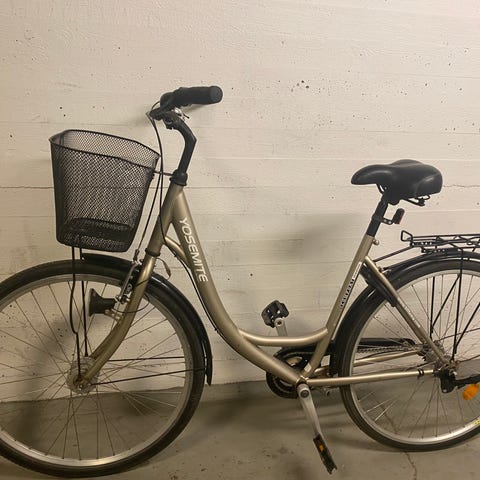 Blå DBS damcykel med, 28" hjul och ramstorlek. Utrustad med pakethållare bak, kedjeskydd och fotbroms.