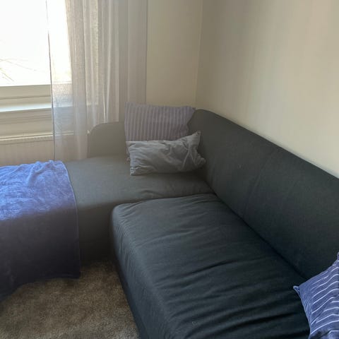 Säljer en stor och bekväm U-formad soffa i svart tyg med schäslong. Perfekt för dig som vill ha gott om sittplatser eller gillar att kunna ligga och slappa ordentligt.