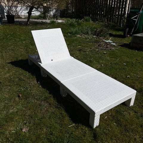 Grå solsäng i konstrotting för altan eller trädgård. Rak modell med hög ryggdel och ben som lyfter upp den från golvet.