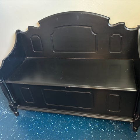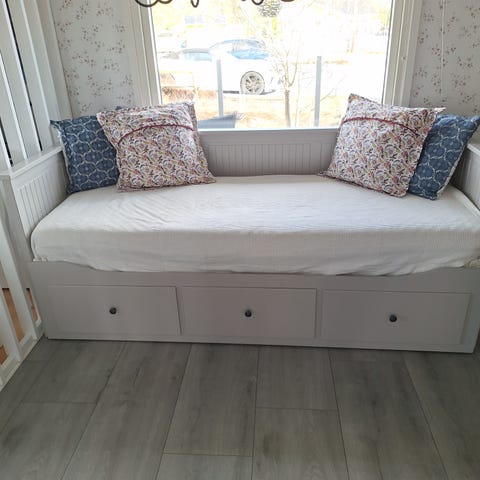 Vitlackad kökssoffa med bra förvaring i sitsen och väldigt bekväm att sitta på. Kläddes om och lackades av It lack för 4 år sedan. Tyget är lite fläckigt och kan behöva en tvätt och barnen har skavt bort lite färg på ett par ställen men det går lätt att snygga till.