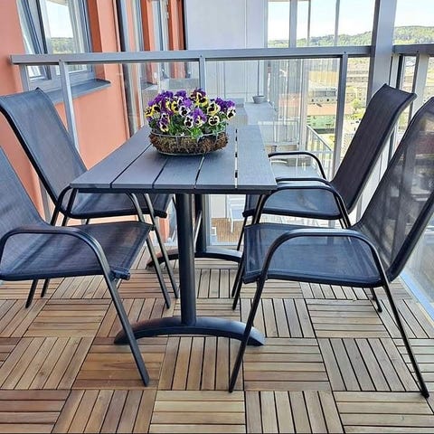 Matgrupp med stort bord i trä och grå metallstativ samt sex blå stoppade positionsstolar med armstöd i trä. Bordsskivan är ribbad och stolarna är fällbara med hög rygg och mjuka dynor.