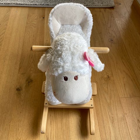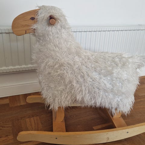Gunghäst i fårmodell från Teddykompaniet med trärunner och mjuk lurvig päls.