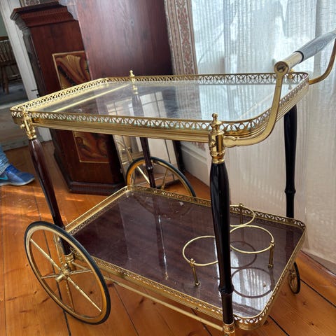 Fin serveringsvagn i trä med mässingsdetaljer och stora hjul. Två hyllplan och hållare för flaskor gör den smidig att rulla runt hemma.