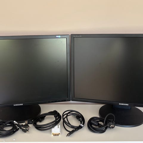 2st Lenovo ThinkVision 22-tums skärm i svart med knappar på framsidan för meny och ljusstyrka. Har flera anslutningar på baksidan för dator och bildkälla.