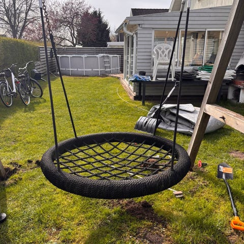 Säljer en stabil och rejäl studsmatta med skyddsnät – perfekt för barnens lek i trädgården.