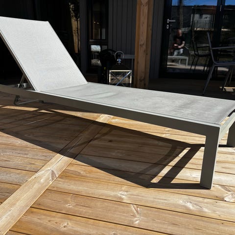 2 st Modena solsäng i grått med ställbart ryggstöd. Har armstöd, hjul bak och slitstark textilduk i sits och rygg. Finns dynor att köpa till hos Mio.