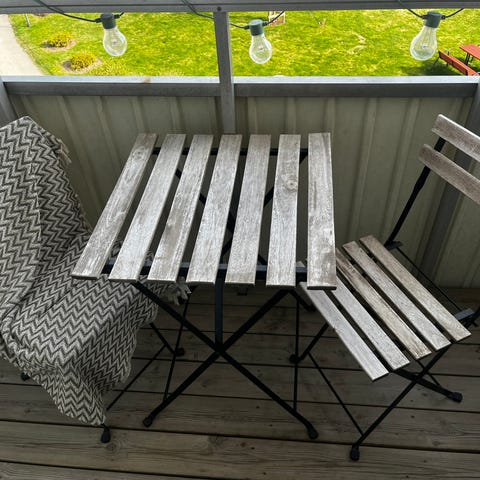 2 st stolar och bord inkl dynor. Bordet har 70 cm i diameter och är ca 74 cm högt