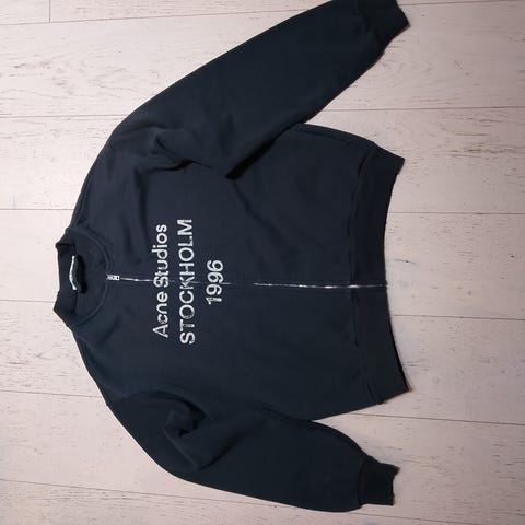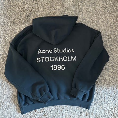 Grà hoodie frän Acne Studios med tryck baktill. Tröjan har en luva och muddar vid ärmslut och nederkant.