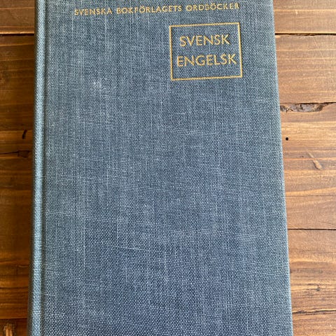 Engelsk-svensk ordbok från Svenska Bokförlaget, skolupplaga tryckt 1961. Inbunden i blågrått tygband med guldtext på framsida och rygg.
