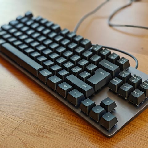 Keychron Q1 mekaniskt tangentbord med 75% layout och gråa keycaps. Har RGB-belysning och ansluts med kabel via USB.