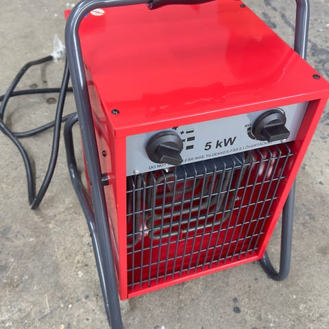Sandberg byggfläkt/element på 2 kW i röd metallkåpa. Har bärhandtag upptill, vred för värmeläge och termostat samt elkabel framtill.
