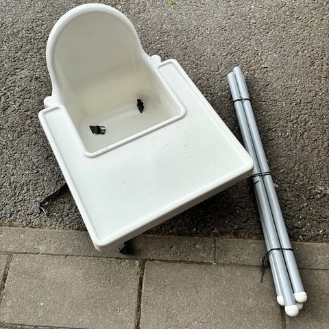 Vit barnmatstol från IKEA med metallben.