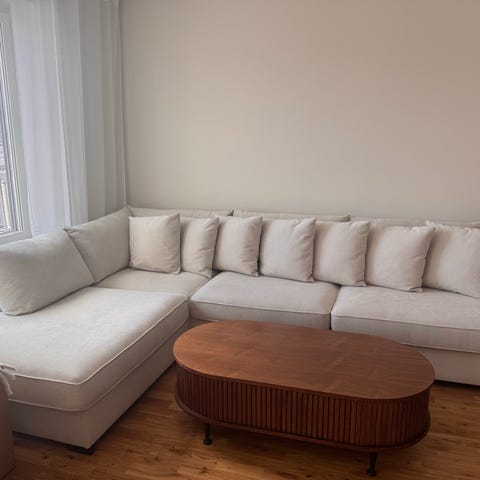 En stor U-soffa som katterna gjort till sin (som synses på kuddarna). Den går säkert att frisera till lite om man vill. Klädseln skulle må bra av en tvätt. Lite insutten på vissa ställen men fortfarande den mest bekväma soffa jag någonsin haft. Stor och rymlig, två personer kan lätt sova i den.