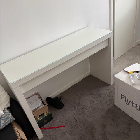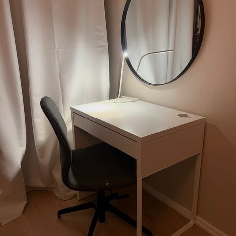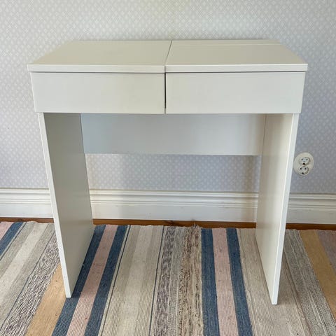Vitt skrivbord/sminkbord från IKEA med en bred utdragslåda framtill. På sidan finns ett skåp med hyllplan som ger extra förvaring för smink, papper eller annat smått.